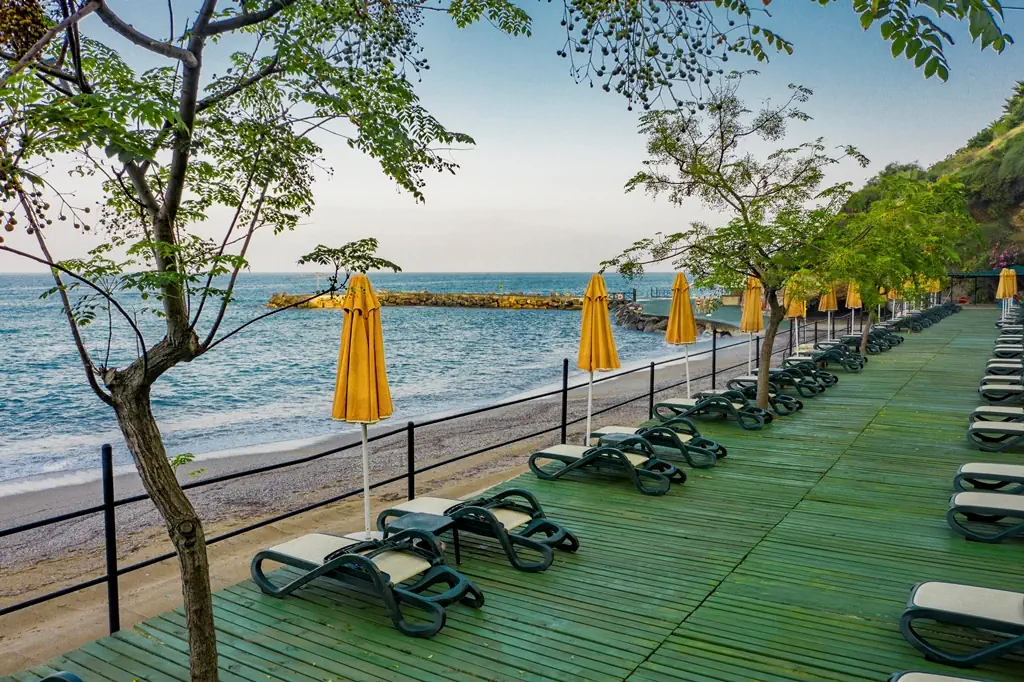 Prywatna, Piaszczysta, Piaszczyste zejście do morza, Dojście do plaży przez ulicę, tunelem itp., odleglość do plaży: 150 m, długość plaży: 250 m, pomost na plaży, Parasole - bezpłatnie, Leżaki - bezpłatnie, Ręczniki - bezpłatnie, Beach Bar - bezpłatnie, Bus hotelowy do plaży, Prysznic