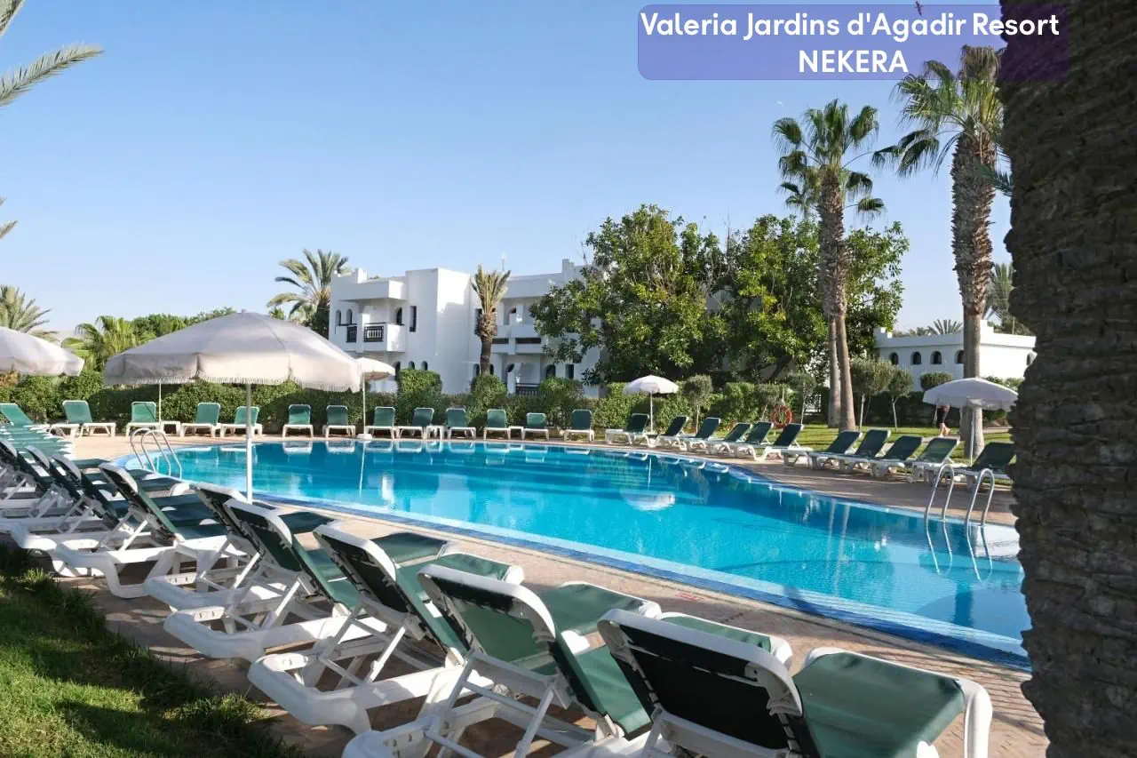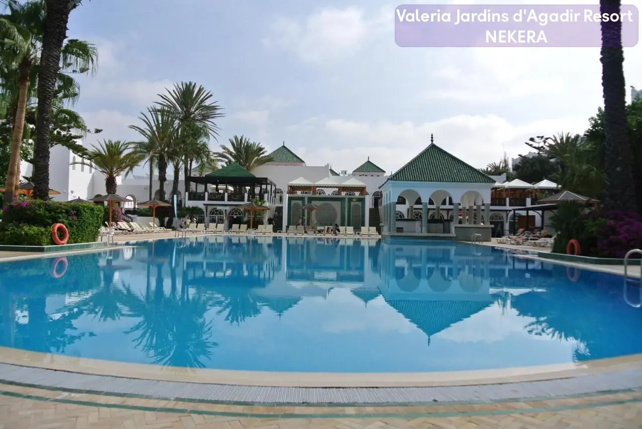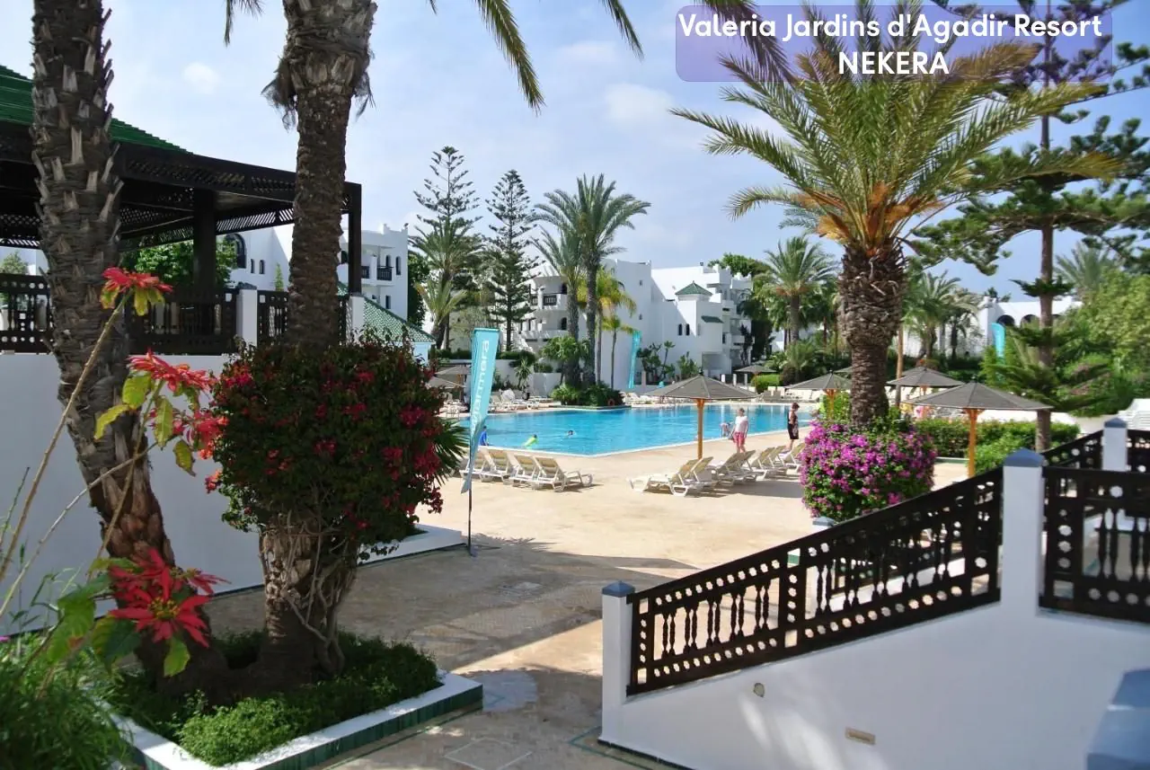 Valeria Jardins d'Agadir Resort to czterogwiazdkowy hotel typu all-inclusive, znajdujący się w turystycznej dzielnicy Agadiru, zaledwie kilka minut spacerem od pięknej, piaszczystej plaży. Otoczony ogrodem palmowym, resort oferuje idealne warunki zarówno dla rodzin, jak i par, które szukają relaksu i rozrywki w słonecznym Agadirze. To doskonałe miejsce na wakacje dla rodzin, par i grup przyjaciół, które szukają komfortowego wypoczynku z bogatą ofertą rozrywek i udogodnień w pobliżu malowniczej plaży i atrakcji Agadiru.