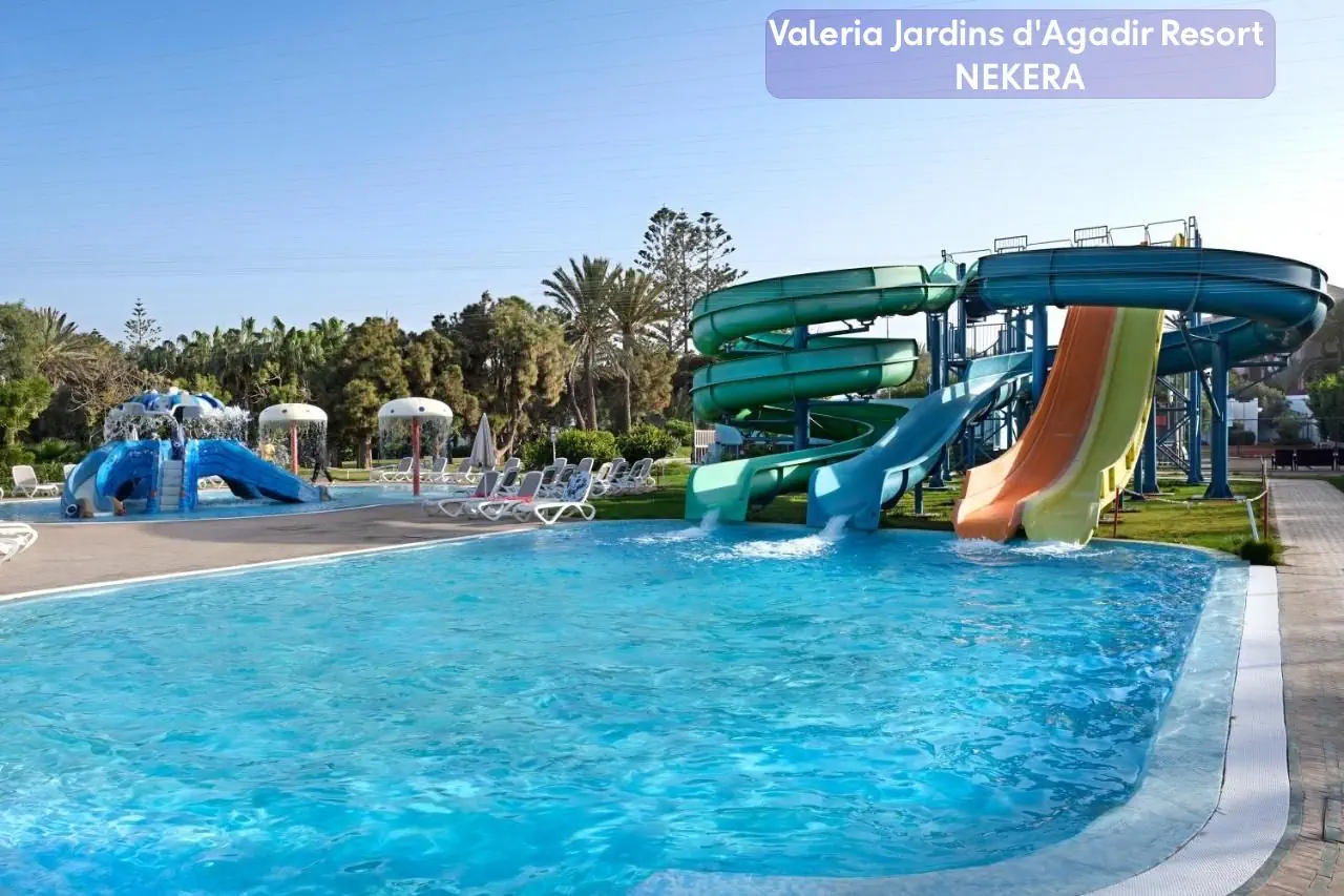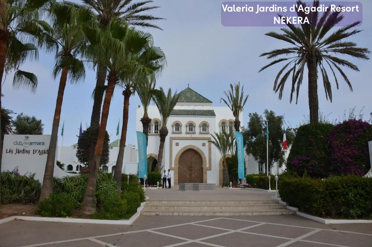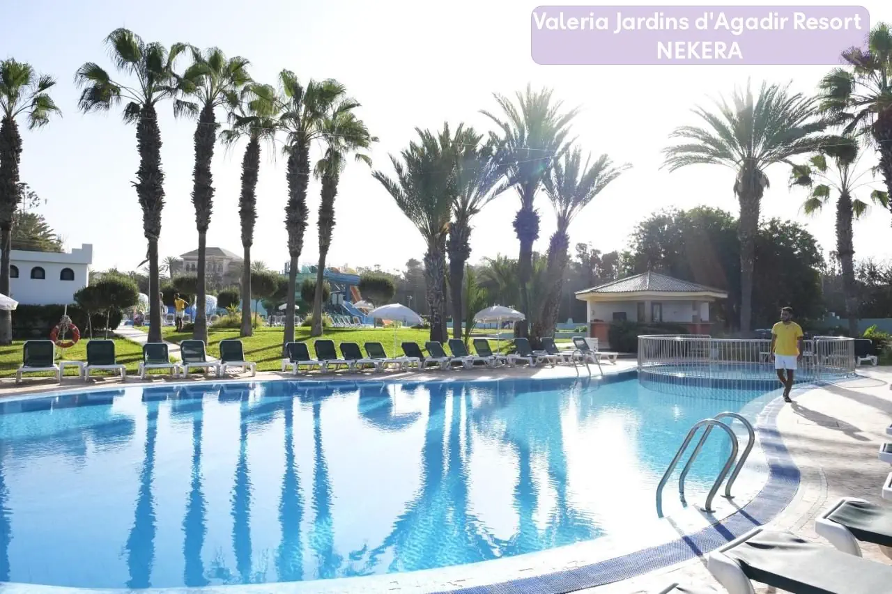 Valeria Jardins d'Agadir Resort to czterogwiazdkowy hotel typu all-inclusive, znajdujący się w turystycznej dzielnicy Agadiru, zaledwie kilka minut spacerem od pięknej, piaszczystej plaży. Otoczony ogrodem palmowym, resort oferuje idealne warunki zarówno dla rodzin, jak i par, które szukają relaksu i rozrywki w słonecznym Agadirze. To doskonałe miejsce na wakacje dla rodzin, par i grup przyjaciół, które szukają komfortowego wypoczynku z bogatą ofertą rozrywek i udogodnień w pobliżu malowniczej plaży i atrakcji Agadiru.