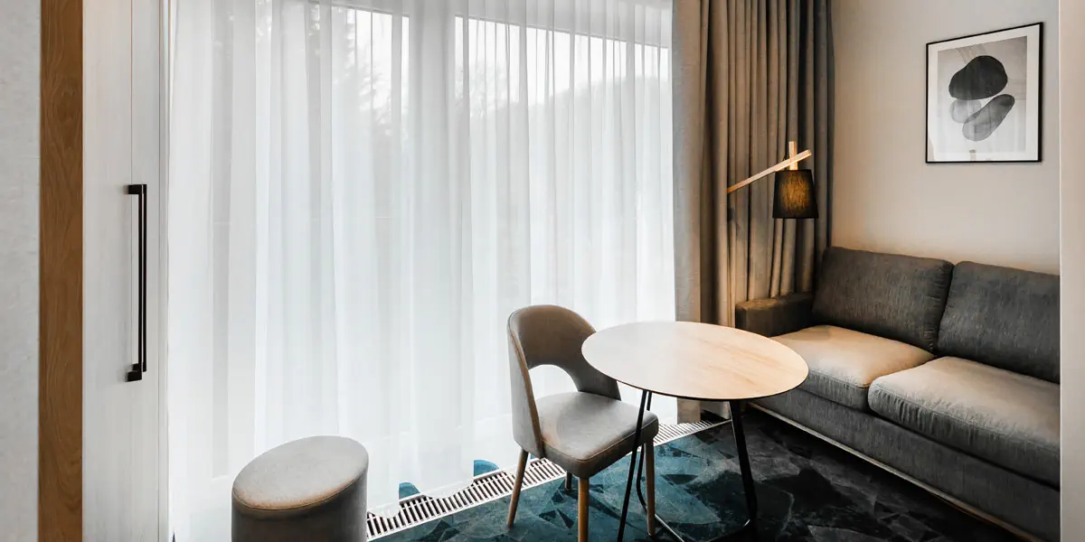 Komfortowy klimatyzowany pokój z częścią sypialną oraz dzienną i łazienką
