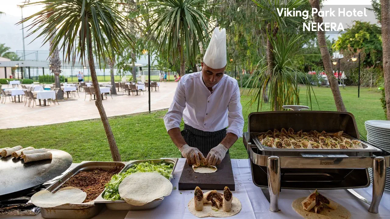 ALL - all inclusive; cztery posiłki w formie bufetu w restauracji głównej: śniadanie( 07:30 - 10:00), późne śniadanie (10:00 - 11:00), obiad (12:30 - 14:00), obiad (19:00 - 21:00). Bar z przekąskami: bufet, pizza, pita etc. (14:30 - 17:00); lody (16:30 - 17:00); herbata i wyroby cukiernicze (17:00 - 18:00). 2 bary (10:00 - 23:00): w lobby Lobby Bar i przy basenie Pool Bar. Napoje bezalkoholowe i lokalne napoje alkoholowe: bezpłatnie. Za dodatkową opłatą: wybrane importowane napoje alkoholowe, bezalkoholowe (w puszkach, butelkach), świeżo wyciskane soki, paczkowane lody, minibar, room service, turecka kawa mocca, espresso i cappucino oraz wszystkie napoje/posiłki serwowane po godzinie 23:00.