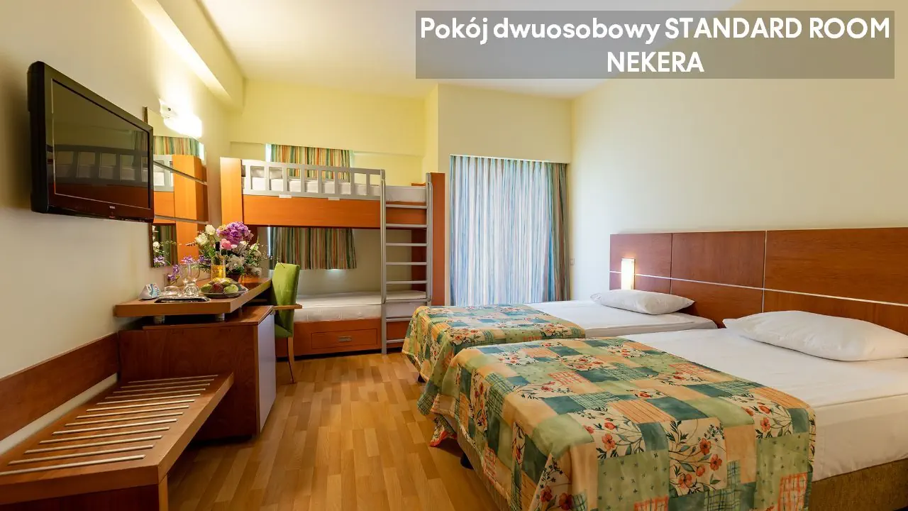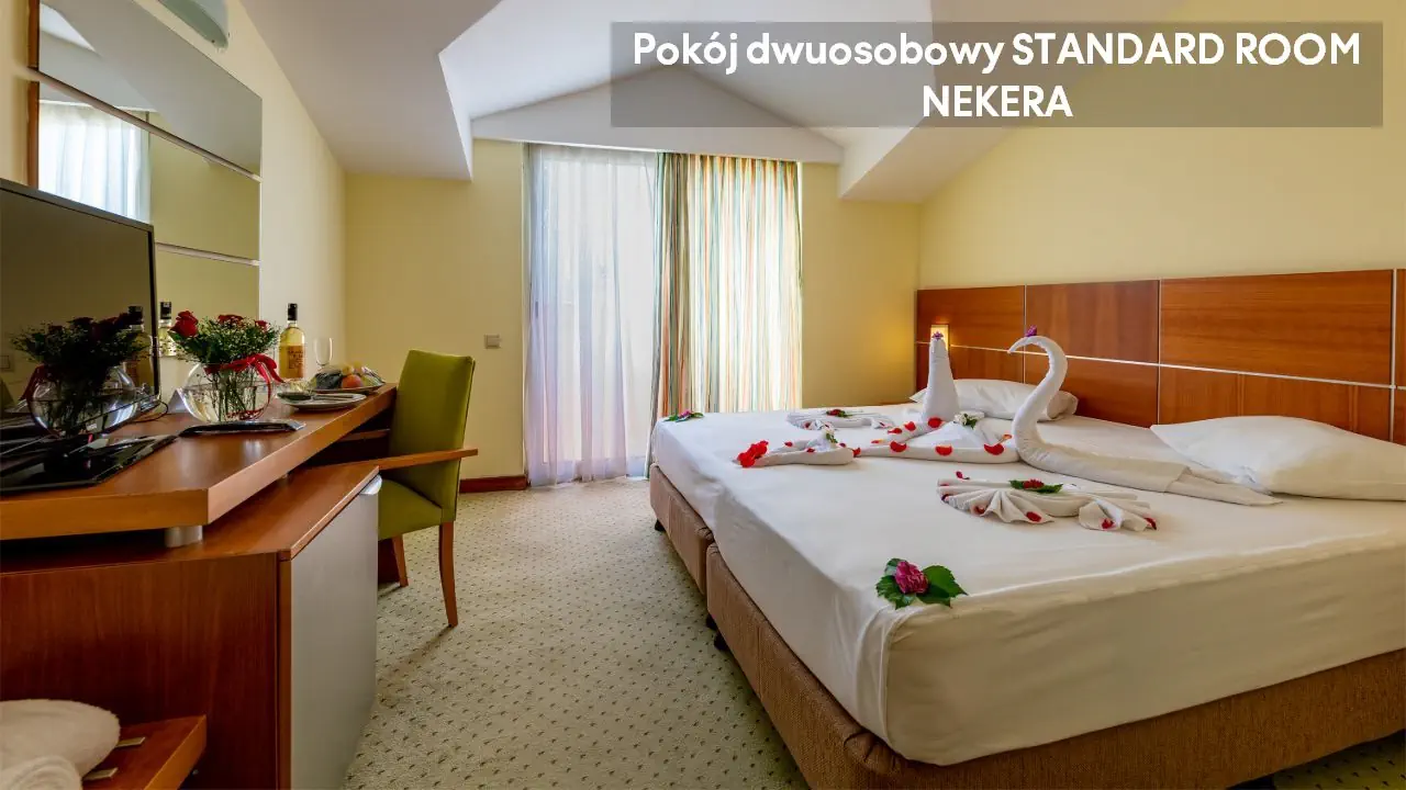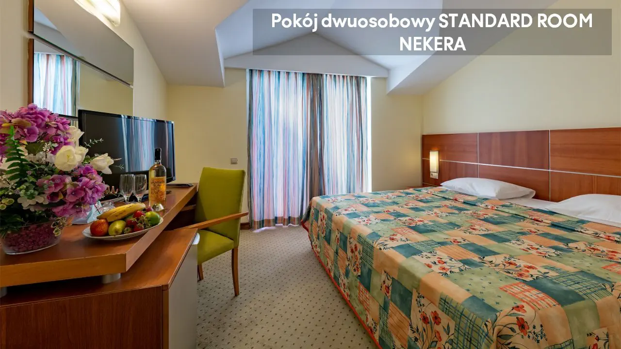 pokój dwuosobowy STANDARD ROOM: ok. 20 - 30 m²; klimatyzacja, balkon, część wypoczynkowo-relaksacyjna, telefon, TV, Wi-Fi, minibar (za dodatkową opłatą), prywatna łazienka (toaleta, ręczniki suszarka do włosów, wanna/prysznic); sejf (za dodatkową opłatą).