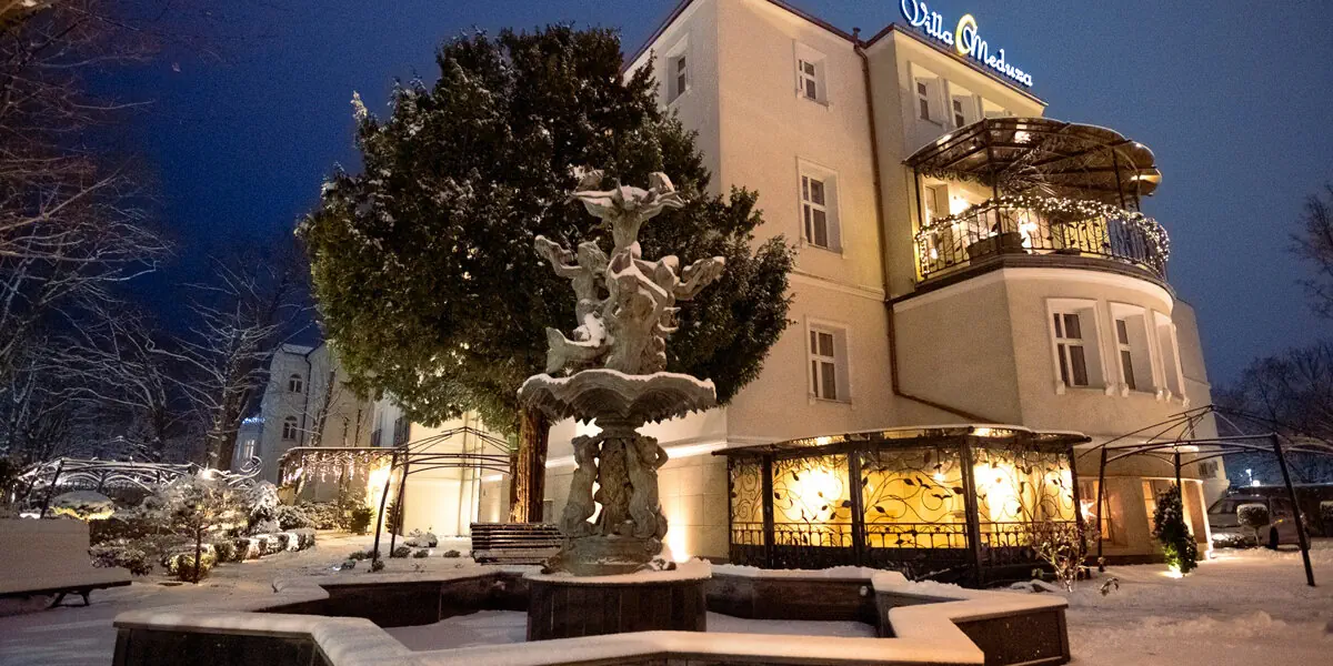 Villa Meduza to butikowy obiekt w Kołobrzegu, położony w samym centrum malowniczej nadmorskiej strefy uzdrowiska, zaledwie 150 m od szerokiej, czystej i piaszczystej plaży. To duży atut tego miejsca, które szczyci się korzystnym mikroklimatem, otoczeniem centralnej części nadmorskiego parku oraz niewielką odległością od takich atrakcji jak latarnia morska czy port w Kołobrzegu. Willę otacza piękny, niemal magiczny ogród z miejscami do wypoczynku. Obiekt jest przeznaczony dla gości powyżej 12 roku życia. Udogodnienia: SPA, Sauna, Masaże, Wellness, Zabiegi odnowy biologicznej, Bar / restauracja, Ogród / Park, Winda, Parking, Płatność kartą
