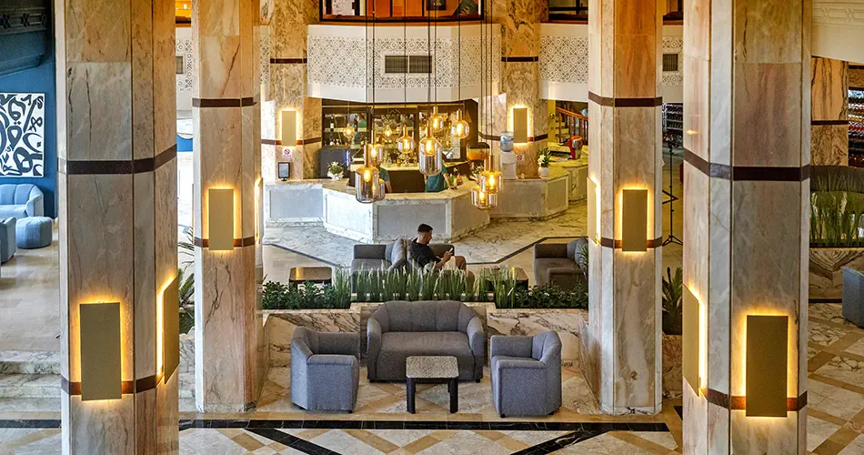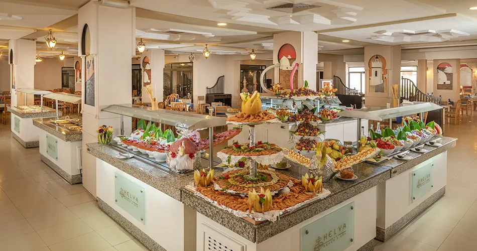- Recepcja - 3 restauracje w tym płatne - 3 bary w tym płatne - Kawiarnia mauretańska (shisha i kawa turecka płatne) - 2 baseny zewnętrzne z wydzieloną sekcją dla dzieci - Zjeżdżalnie (od maja do października, dzieci od lat 4 do lat 12, wzrost do 120 cm) - Basen wewnętrzny (podgrzewany w sezonie zimowym od Listopada do Kwietnia) - Brodzik - Kantor wymiany walut - Galeria handlowa, mini market - Centrum SPA - Oficjalna kategoria hotelu 4*