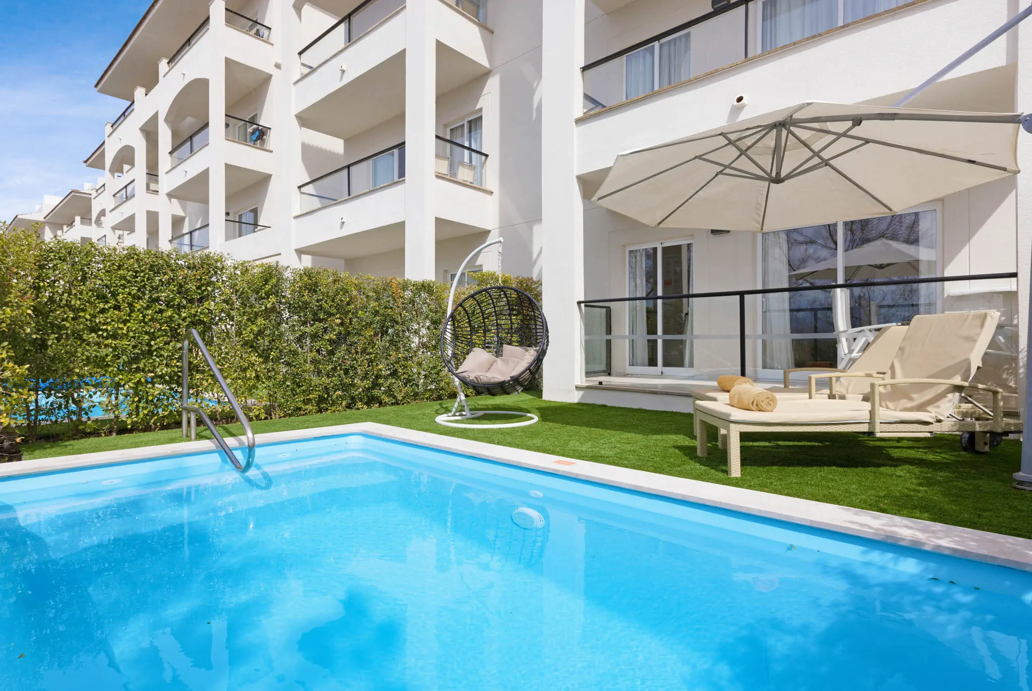 Dla max. 4 osób, Przestrzeń zewnętrzna: Balkon i taras, Kanały telewizji: Angielski, Telefon w pokoju, Aneks kuchenny, prysznic, Powierzchnia pokoju: ok. 50 - 53 m2, Dostawka: sofa, Rodzaj podłogi: laminat, Sprzątanie codziennie, Salon, część jadalniana, 1 sypialnia, Drzwi przesuwne, Maksymalna liczba osób dorosłych: 3, Maksymalna liczba dzieci: 2, Od strony basenu, Prywatny basen, Liczba łazienek: 1, Liczba toalet: 1, Kuchenka mikrofalowa, Klimatyzacja: Klimatyzacja centralna, Działa w godzinach: 24h, Czerwiec, Lipiec, Sierpień