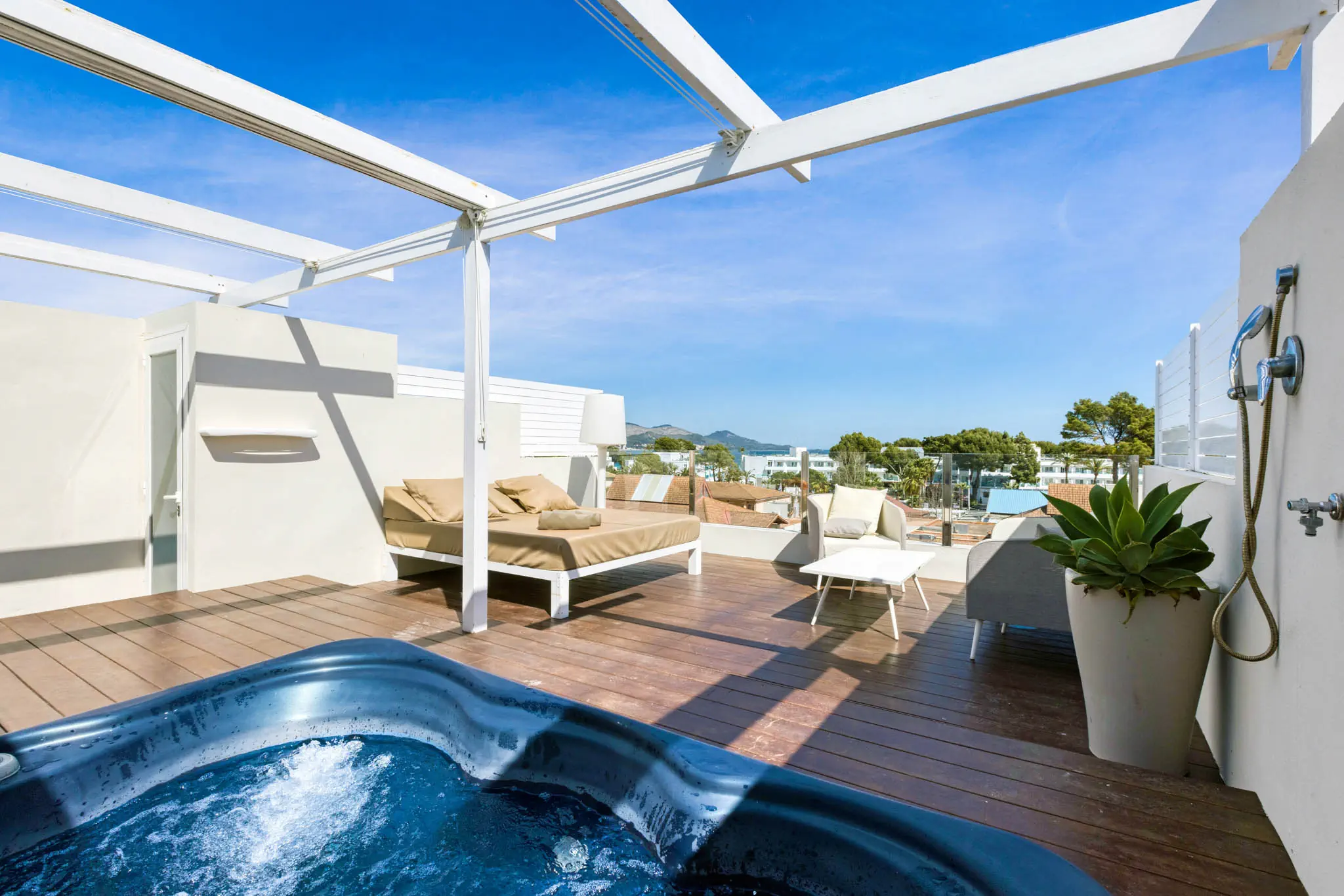 Dla max. 4 osób, Przestrzeń zewnętrzna: Balkon i taras, Kanały telewizji: Angielski, Telefon w pokoju, Aneks kuchenny, prysznic, jacuzzi, Powierzchnia pokoju: ok. 50 - 53 m2, Dostawka: sofa, Rodzaj podłogi: laminat, Sprzątanie codziennie, Salon, część jadalniana, 1 sypialnia, Drzwi przesuwne, Maksymalna liczba osób dorosłych: 3, Maksymalna liczba dzieci: 2, Prysznic na świeżym powietrzu, Widok niesprecyzowany , Liczba łazienek: 1, Liczba toalet: 1, Kuchenka mikrofalowa, Klimatyzacja: Klimatyzacja centralna, Działa w godzinach: 24h, Czerwiec, Lipiec, Sierpień