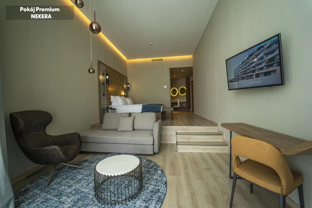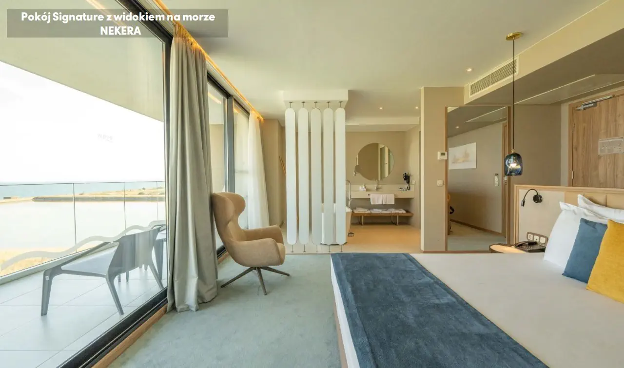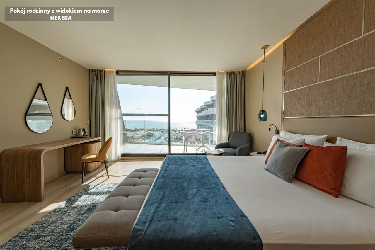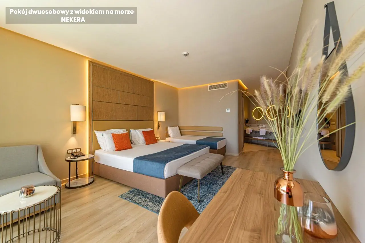 Pokoje dwuosobowe low cost z widokiem na ogród LOW COST DOUBLE ROOM GARDEN VIEW: ok. 26 m2; dla max. 3 os.; łóżko podwójne + 1 pojedyncze; wyposażenie: prywatna łazienka (wanna/prysznic, suszarka do włosów, WC), klimatyzacja, sejf (bezpłatny); mini bar (bezpłatne napoje bezalkoholowe oraz piwo), zestaw do parzenia kawy/herbaty; Wi-Fi (bezpłatne), TV, telefon, balkon. Pokoje dwuosobowe z częściowym widokiem na morze DOUBLE ROOM SIDE SEA VIEW: ok. 26 m2; dla max. 3 os.; łóżko podwójne + 1 pojedyncze; wyposażenie: prywatna łazienka (wanna/prysznic, suszarka do włosów, WC), klimatyzacja, sejf (bezpłatny); mini bar (bezpłatne napoje bezalkoholowe oraz piwo), zestaw do parzenia kawy/herbaty; Wi-Fi (bezpłatne), TV, telefon, balkon. Pokoje dwuosobowe z widokiem na morze DOUBLE ROOM SEA VIEW: ok. 26 m2; dla max. 3 os.; łóżko podwójne + 1 pojedyncze; wyposażenie: prywatna łazienka (wanna/prysznic, suszarka do włosów, WC), klimatyzacja, sejf (bezpłatny); mini bar (bezpłatne napoje bezalkoholowe oraz piwo), zestaw do parzenia kawy/herbaty; Wi-Fi (bezpłatne), TV, telefon, balkon. Pokoje premium z częściowym widokiem na morze PREMIUM ROOM SIDE SEA VIEW: ok. 44 m2; dla max. 3 os. dorosłych lub 2 osób dorosłych i dziecka; łóżko podwójne + sofa w części wypoczynkowej ; wyposażenie: prywatna łazienka (wanna/prysznic, suszarka do włosów, WC), klimatyzacja, sejf (bezpłatny); mini bar (bezpłatne napoje bezalkoholowe oraz piwo), zestaw do parzenia kawy/herbaty; Wi-Fi (bezpłatne), TV, telefon, balkon. Pokoje premium z widokiem na morze PREMIUM ROOM SEA VIEW: ok. 48 m2; dla max. 3 os.; łóżko podwójne + łóżko pojedyncze ; wyposażenie: prywatna łazienka (wanna/prysznic, suszarka do włosów, WC), klimatyzacja, sejf (bezpłatny); mini bar (bezpłatne napoje bezalkoholowe oraz piwo), zestaw do parzenia kawy/herbaty; Wi-Fi (bezpłatne), TV, telefon, balkon. Pokoje rodzinne z widokiem na morze FAMILY ROOM SEA VIEW: ok. 48 m2; dla max. 4 os.; 2 sypialnie ; wyposażenie: prywatna łazienka (wanna/prysznic, suszarka do włosów, WC), klimatyzacja, sejf (bezpłatny); mini bar (bezpłatne napoje bezalkoholowe oraz piwo), zestaw do parzenia kawy/herbaty; Wi-Fi (bezpłatne), TV, telefon, balkon. Pokoje rodzinne z częściowym widokiem na morze FAMILY ROOM SIDE SEA VIEW: ok. 59 m2; dla max. 4 os.; 2 sypialnie, łóżko podwójne + 2 łóżka pojedyncze; wyposażenie: prywatna łazienka (wanna/prysznic, suszarka do włosów, WC), klimatyzacja, sejf (bezpłatny); mini bar (bezpłatne napoje bezalkoholowe oraz piwo), zestaw do parzenia kawy/herbaty; Wi-Fi (bezpłatne), TV, telefon, balkon. Pokoje typu Maisonette z widokiem na morze MAISONETTE ROOM SEA VEW: ok. 95 m2; dla max. 5 os.; podwójne + 3 łóżka pojedyncze,, 2 piętra; wyposażenie: prywatna łazienka (wanna/prysznic, suszarka do włosów, WC), klimatyzacja, sejf (bezpłatny); mini bar (bezpłatne napoje bezalkoholowe oraz piwo), zestaw do parzenia kawy/herbaty; Wi-Fi (bezpłatne), TV, telefon, balkon. Pokoje Signature z widokiem na morze SIGNATURE ROOM SEA VIEW: ok. 36 m2; dla max. 2 os.; łóżko podwójne; wyposażenie: prywatna łazienka (wanna/prysznic, suszarka do włosów, WC), klimatyzacja, sejf (bezpłatny); mini bar (bezpłatne napoje bezalkoholowe oraz piwo), zestaw do parzenia kawy/herbaty; Wi-Fi (bezpłatne), TV, telefon, balkon. Pokoje typu Corner z widokiem na morze Junior Suite CORNER JUNIOR SUITE SEA VIEW: ok. 43 m2; dla max. 3 os.; łóżko podwójne + sofa jako dostawka; wyposażenie: prywatna łazienka (wanna/prysznic, suszarka do włosów, WC), klimatyzacja, sejf (bezpłatny); mini bar (bezpłatne napoje bezalkoholowe oraz piwo), zestaw do parzenia kawy/herbaty; Wi-Fi (bezpłatne), TV, telefon, balkon. Pokoje Lagoon z dostępem do basenu LAGOON SWIM-UP ROOM: ok. 44 m2; dla max. 3 os.; łóżko podwójne + sofa jako dostawka, bezpośredni dostęp do basenu; wyposażenie: prywatna łazienka (wanna/prysznic, suszarka do włosów, WC), klimatyzacja, sejf (bezpłatny); mini bar (bezpłatne napoje bezalkoholowe oraz piwo), zestaw do parzenia kawy/herbaty; Wi-Fi (bezpłatne), TV, telefon, taras. Ważne: hotel nie akceptuje dostawki dla dzieci poniżej 7 lat.