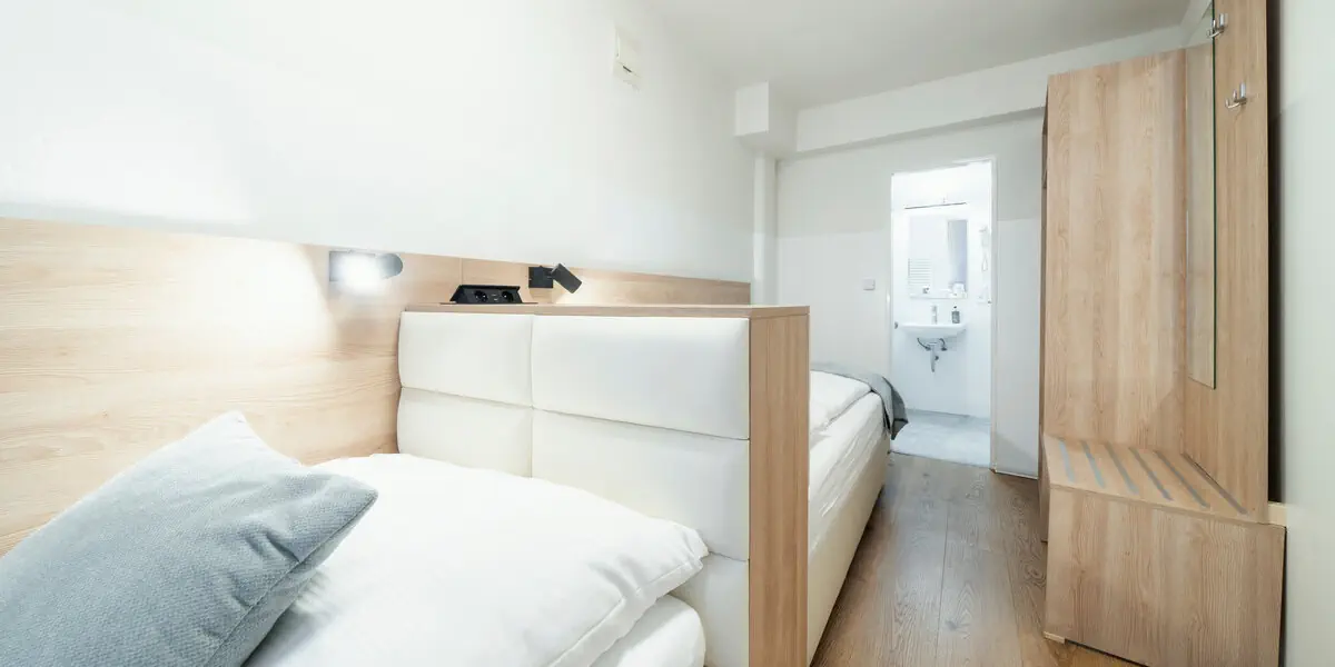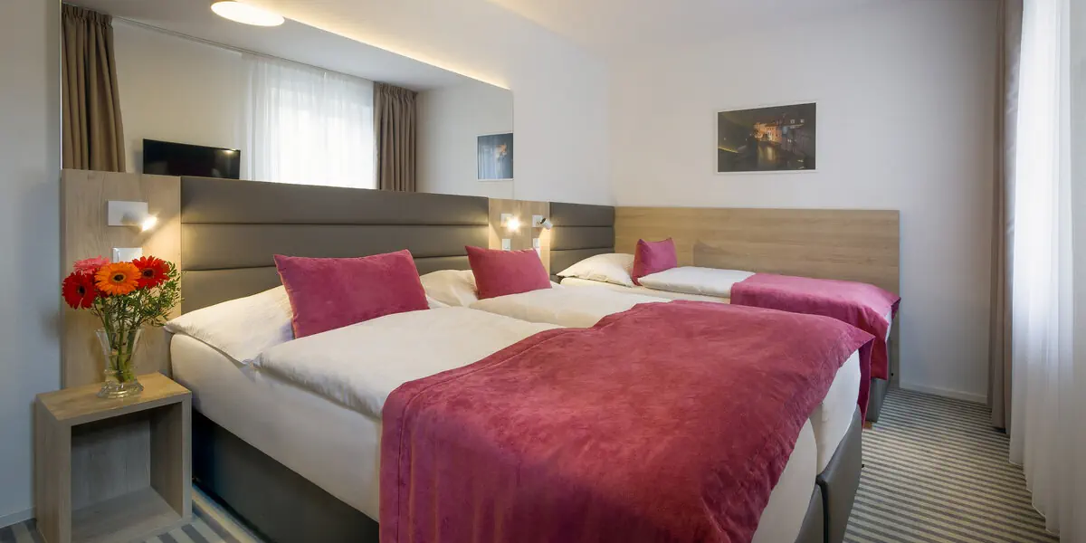 Pokój składa się z dwóch osobnych sypialni: jedna z podwójnym łóżkiem, druga z 2 jednoosobowymi łóżkami