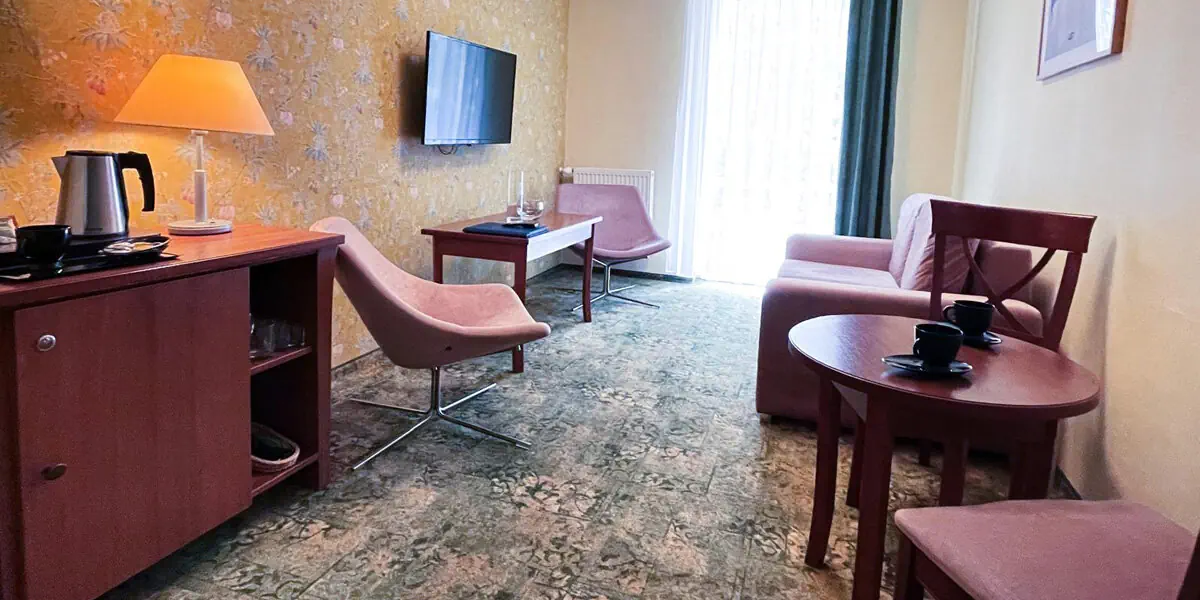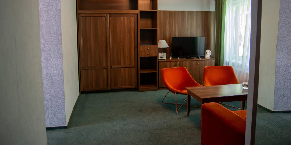 3-pokojowy apartament z dwiema sypialniami, salonem oraz tarasem ze skwerkiem zieleni lub balkonem w budynku hotelowym o podwyższonym standardzie komfort 3*. W wyposażeniu: chłodziarka, zaparzacz wody, szklanki, TV, wifi, prysznic, suszarka do włosów, ręczniki, kosmetyki