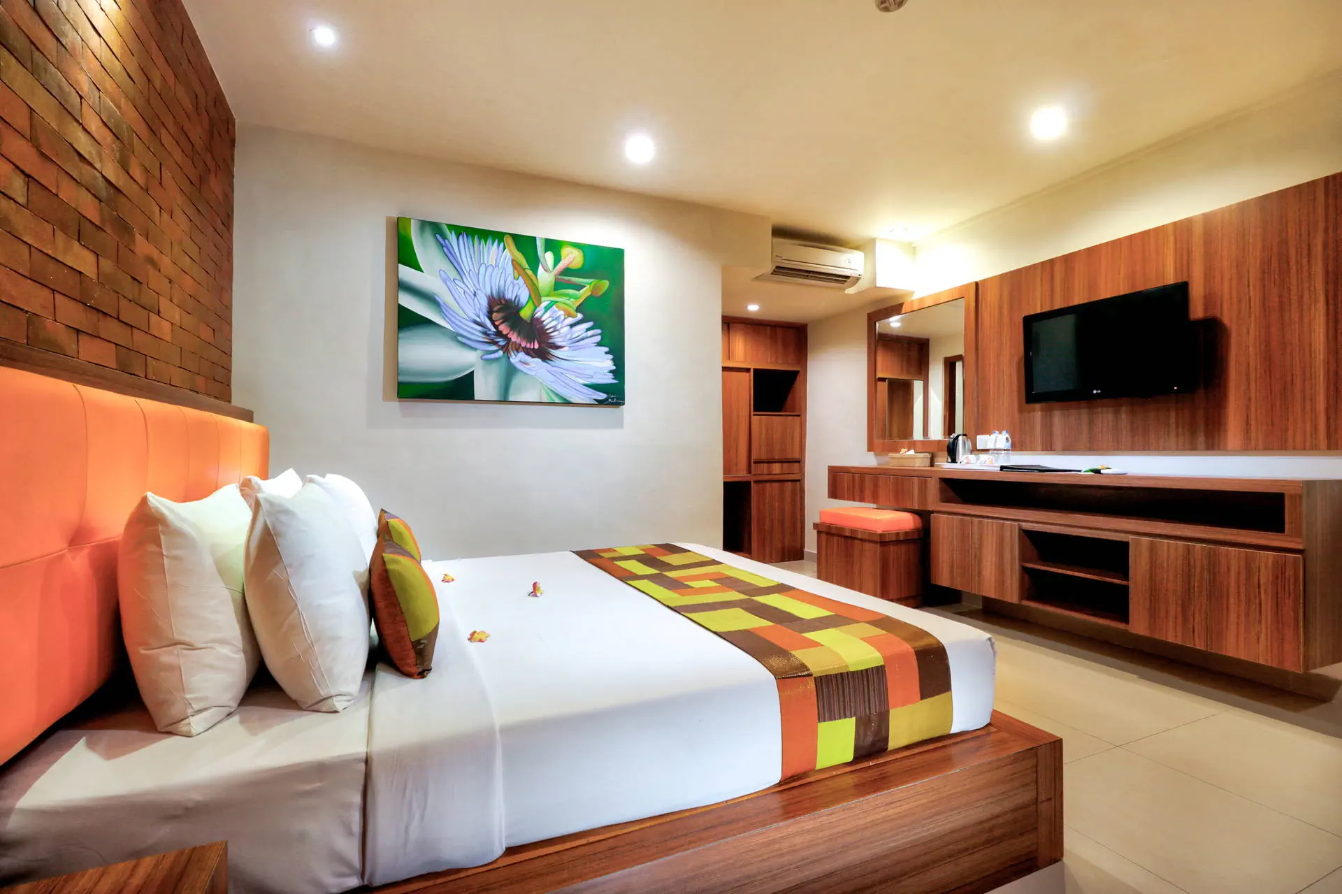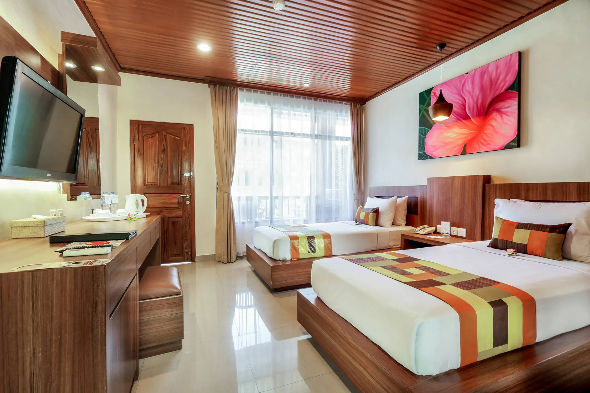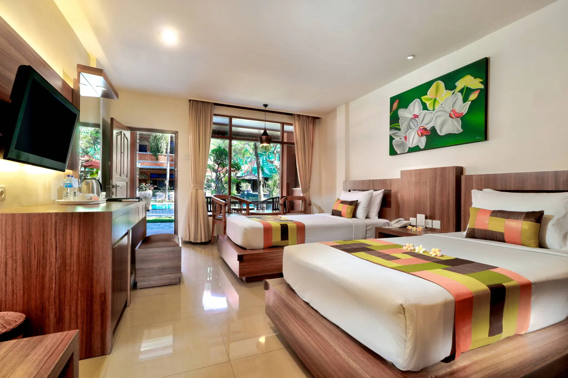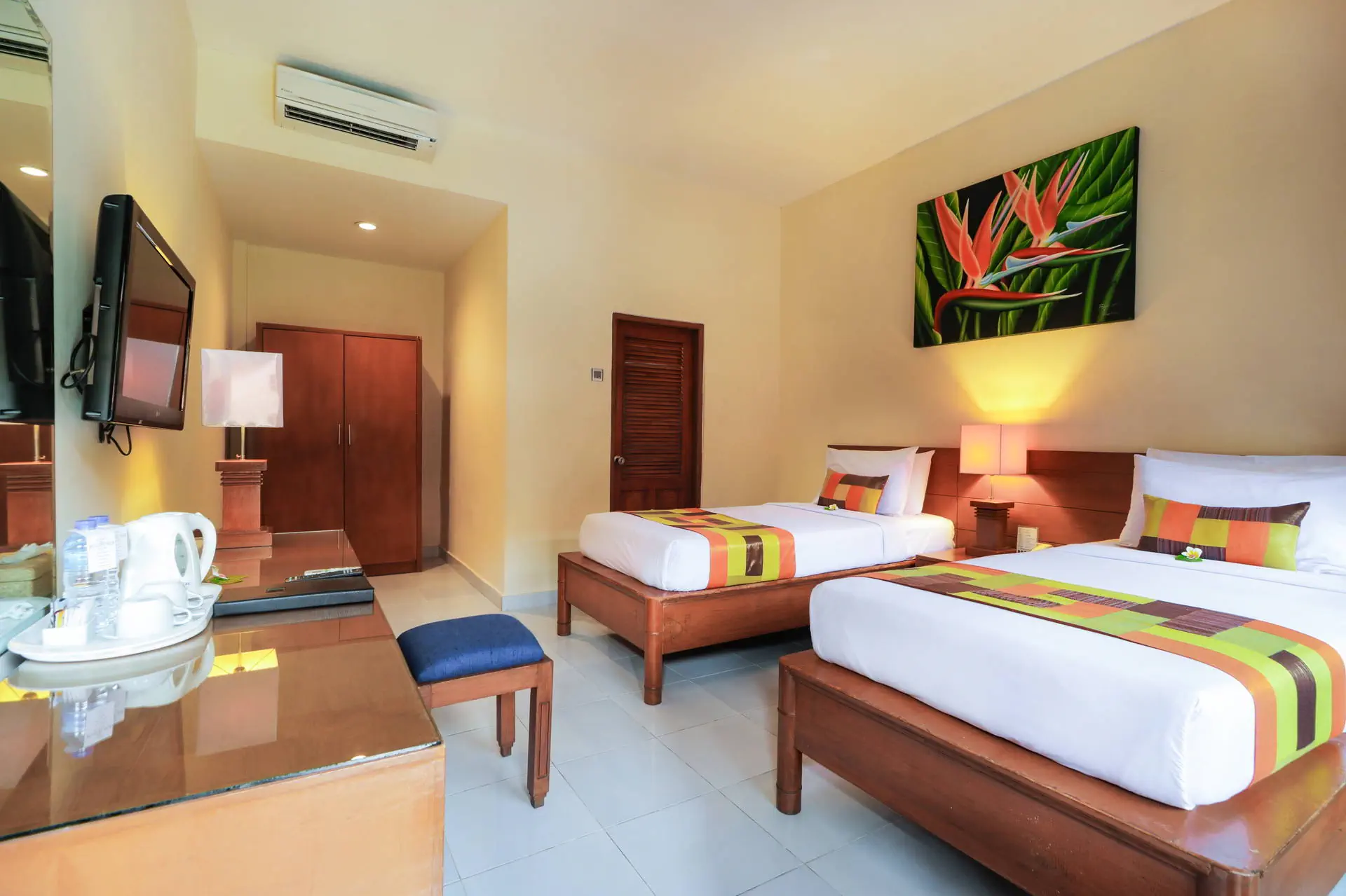 Do dyspozycji gości Całodobowa recepcja. 2 baseny zewnętrzne, 1 basen dla dzieci. Restauracje: restauracja, bar, bar przy basenie. Pozostałe informacje: centrum biznesowe, wypożyczalnia samochodów, wymiana walut, pralnia, bezpłatne transfery do przecznicy Legian oraz placu Kuta, punkt informacji turystycznej. Internet Bezpłatny Internet Wi-Fi we wszystkich pomieszczeniach hotelu. Kategoria lokalna *** Naszym zdaniem Hotel oferuje funkcjonalnie urządzone pokoje i przyjazną obsługę, co tworzy kameralną atmosferę. Położony blisko piaszczystej plaży, zapewnia łatwy dostęp do nadmorskich atrakcji. Otoczony starannie zagospodarowanym terenem z tropikalną roślinnością, jest doskonałym miejscem na relaksujący wypoczynek. Plaża Plaża Kuta Beach oddalona o około 200 metrów od hotelu. Słynna, szeroka, piaszczysta. Brak hotelowych leżaków i parasoli na plaży. Pokoje W obiekcie znajduje się 184 przytulnie urządzonych pokoi 2-osobowych z możliwością jednej dostawki. W każdym z nich jest łazienka (WC, prysznic/wanna), balkon/taras, indywidualnie sterowana klimatyzacja (bezpłatna), TV, telefon, mini bar, zestaw do przygotowania kawy lub herbaty, sejf (bezpłatny). Położenie Hotel o tradycyjnej, balijskiej architekturze zlokalizowany jest ok. 8 km od lotniska w Denpasar. Obiekt usytuowany jest w miejscowości Kuta, w południowej części Bali. Kuta jest jednym z najbardziej znanych kurortów na wyspie dzięki urozmaiconym i urokliwym restauracjom oraz licznym barom i dyskotekom. Program sportowy i animacyjny Siłownia i pokój gier. Płatne dodatkowo: SPA i salon piękności. Strona www Wyżywienie Rodzaje wyżywienia i posiłki: Śniadania w formie bufetu. Restauracje: Restauracja Lagenda Malaysian Food Garden serwująca potrawy kuchni malezyjskiej, indonezyjskiej oraz międzynarodowej. Mogą obowiązywać dodatkowe opłaty. Bary: Bar przy basenie: napoje i przekąski. The Beji Bar: napoje i przekąski.