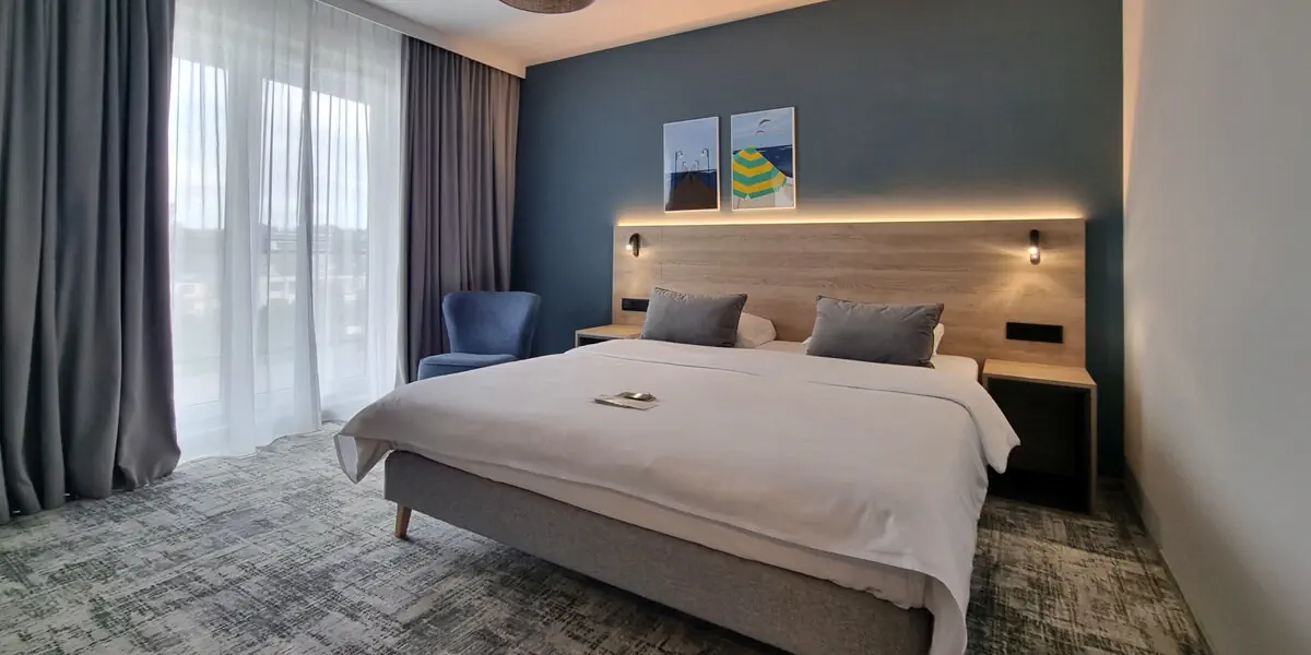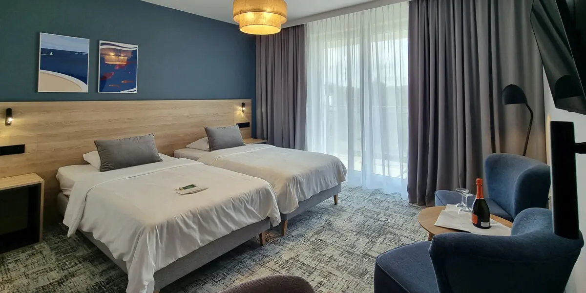 Przestronny i funkcjonalnie urządzony pokój wyposażony w TV, telefon oraz Wi-Fi. Pokój posiada balkon i łazienkę z prysznicem. Dodatkowo leżaki do opalania oraz parawan plażowy.