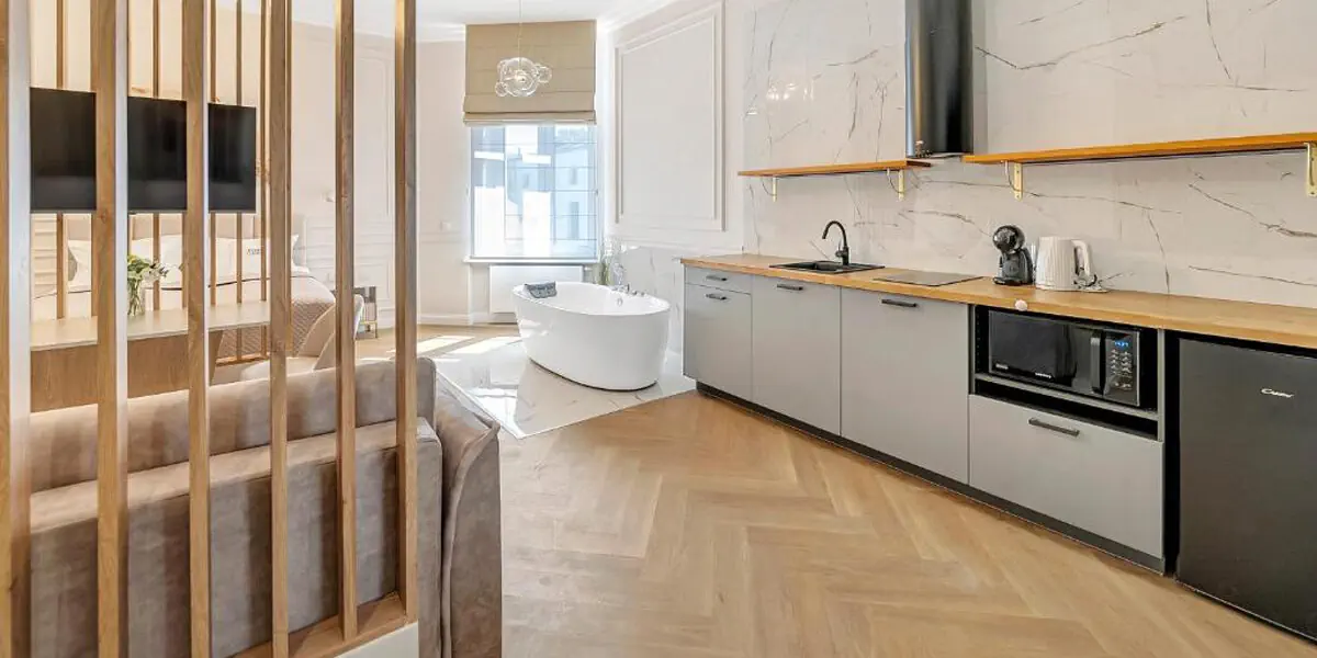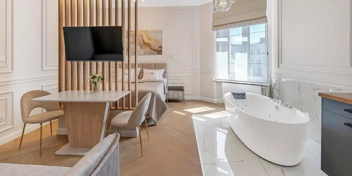 Wielofunkcyjne wnętrze z wanną z hydromasażem w pokoju. Studio posiada także łazienkę z prysznicem, rozkładaną kanapę dla 2 osób i dodatkowo aneks kuchenny