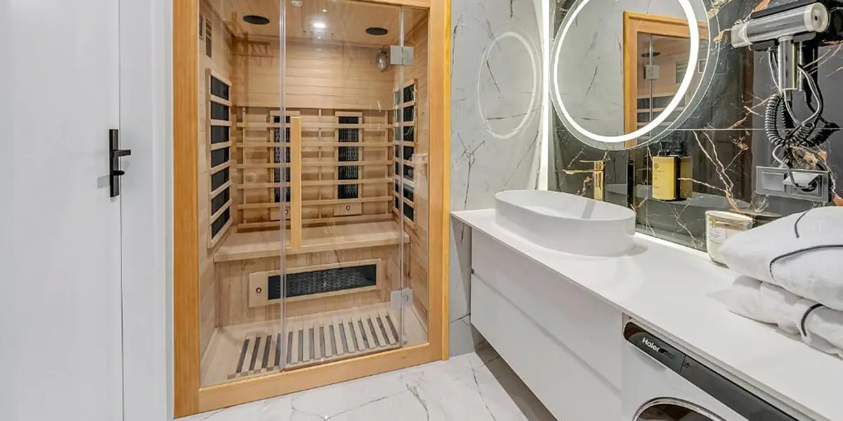 Dwupokojowy apartament z odrębną sypialnią. Posiada łazienkę z prywatną sauną, prysznicem i pralką, rozkładaną kanapę dla 2 osób i dodatkowo aneks kuchenny