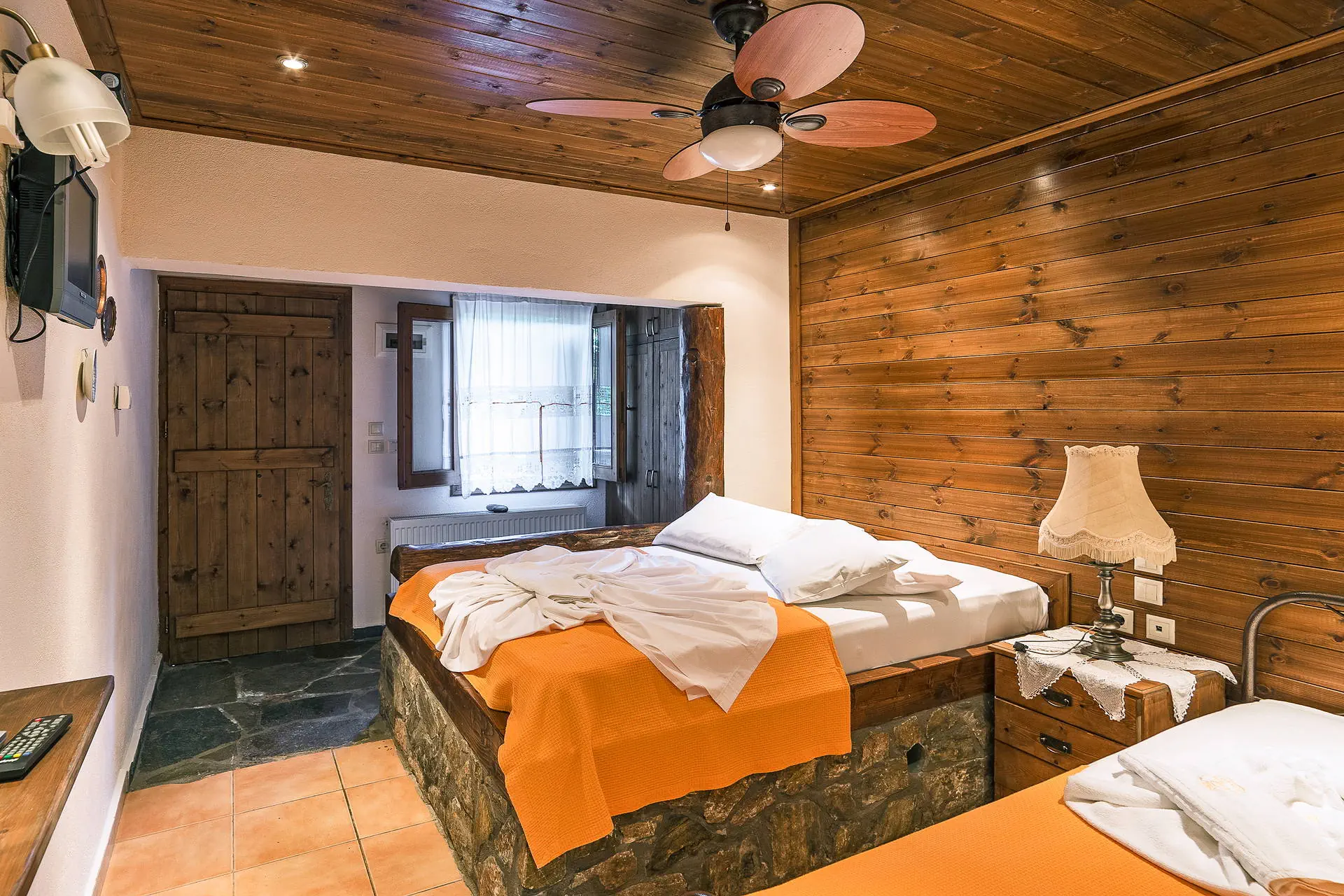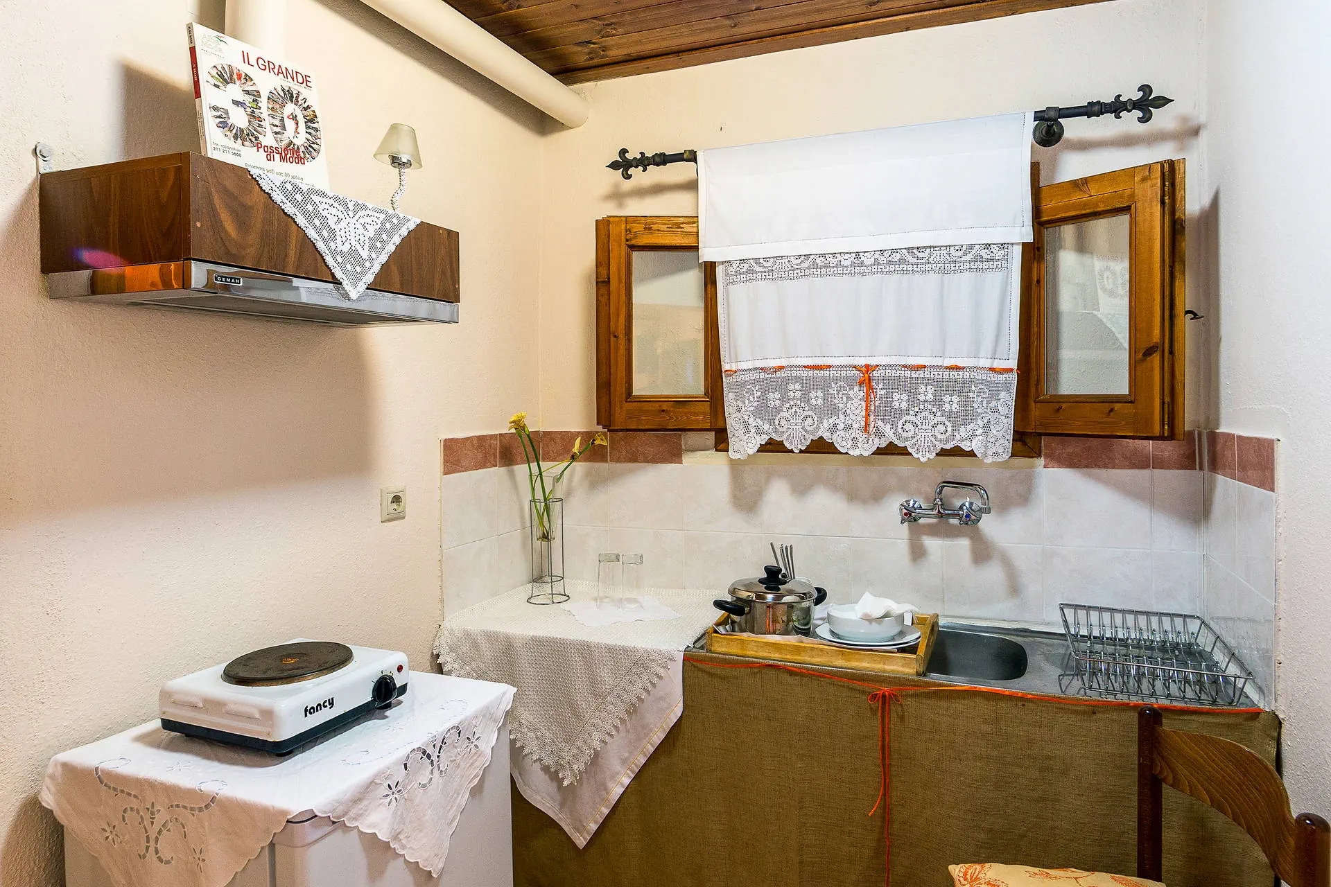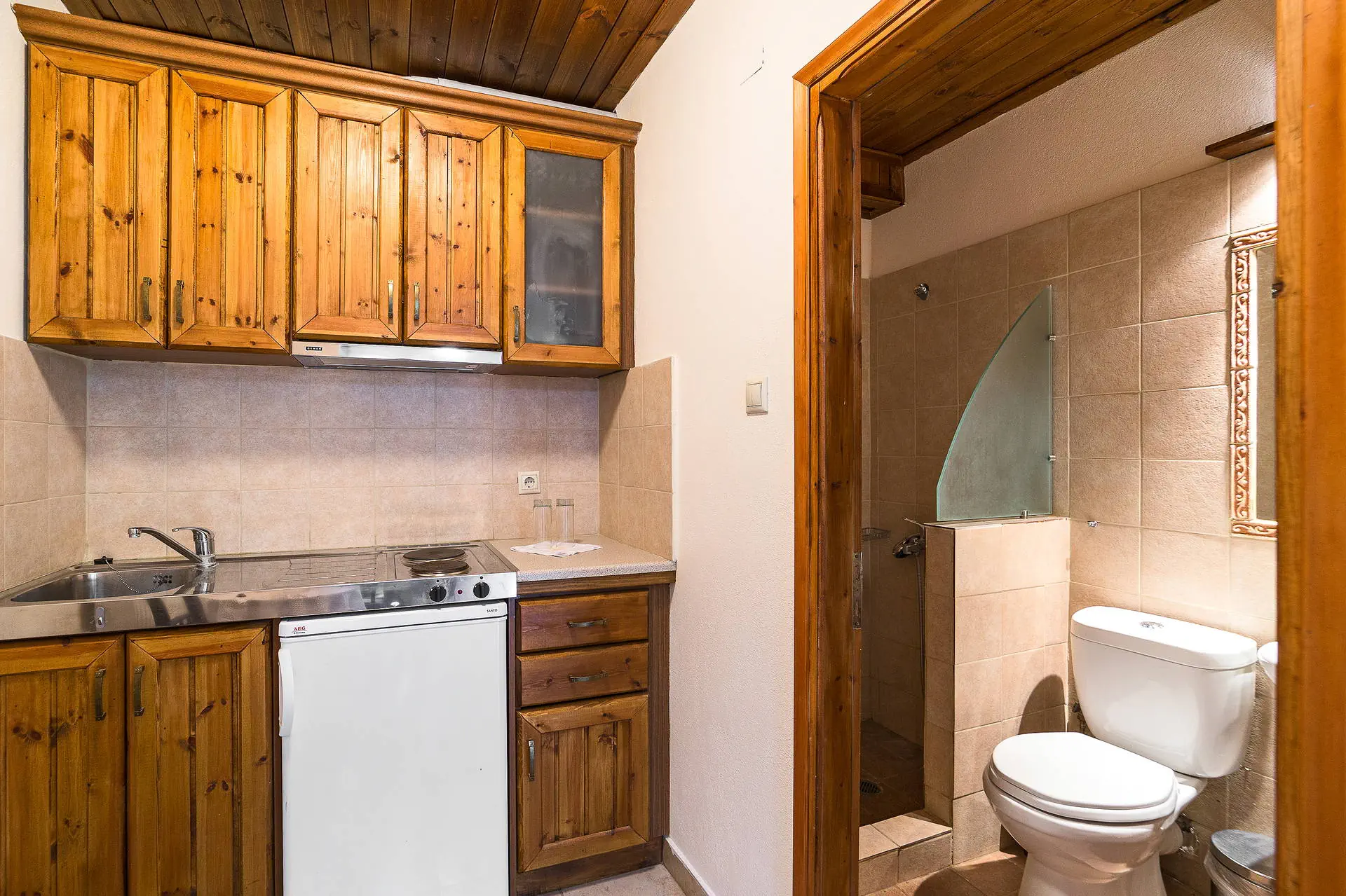 Do dyspozycji gości Ładnie urządzona sala TV. Niewielki, bardzo zadbany teren zielony okalający budynek, stoliki i krzesełka oraz miejsce do grillowania. Internet Obiekt posiada bezprzewodową sieć Wi-Fi. Kategoria lokalna Trzy klucze Naszym zdaniem Obiekt oferuje komfortowe pokoje, które zapewniają przyjemny wypoczynek. Otoczony zielenią i zadbanym ogrodem, tworzy przyjazną, rodzinną atmosferę. Wyjątkowym atutem jest pijalnia wód leczniczych dostępna przez cały pobyt, co stanowi unikalną atrakcję. Serdeczność właścicieli sprawia, że Goście chętnie wracają, co wyróżnia ten obiekt na tle konkurencji. Plaża Kamienisto-żwirowa plaża znajduje się około 750 metrów od hotelu. Kamienisto-żwirowa plaża, inne plaże w okolicy, takie jak Koutsoupia i Platia Amos, są piaszczyste i dobrze zagospodarowane. Leżaki i parasole dostępne bezpłatnie po zamówieniu czegoś w barze plażowym na plażach Koutsoupia i Platia Amos. Bar plażowy dostępny na plażach Koutsoupia i Platia Amos. Pokoje Ładnie i przytulnie wyposażone studia składające się z pokoju dziennego pełniącego jednocześnie funkcję sypialni dla 2, 3 lub 4 osób (w każdym pokoju łóżko małżeńskie, dostawka w przypadku zakwaterowania 3 osób lub łóżko piętrowe w przypadku zakwaterowania 4 osób), aneksu kuchennego z podstawowym wyposażeniem (lodówka, kuchenka, naczynia i sztućce), łazienki z wc oraz balkonu/tarasu z meblami ogrodowymi. Ponadto TV-sat i wiatrak sufitowy. Ręczniki i środki czystości we własnym zakresie. Brak łóżeczek dla dzieci. Położenie Transfer z lotniska Saloniki do obiektu trwa ok. 3,5 godziny, lotnisko oddalone jest o ok. 162 km. Obiekt znajduje się około 300 m od centrum Kokkino Nero. Odległość do plaży wynosi 450 m, a do piaszczystej plaży Platia Amos 1500 m. Położony jest w okolicy z dużą ilością zieleni, naprzeciwko znajdują się naturalne SPA - kamienne zbiorniki kąpielowe oraz ujęcie wody mineralnej. W pobliżu dostępne są dogodne trasy spacerowe i rowerowe. Program sportowy i animacyjny Każdy Klient otrzyma kartę VIP klubu King Size, uprawniającą do zakupu drinków w preferencyjnych cenach. Wyżywienie We własnym zakresie. Istnieje możliwość dopłaty do All inclusive light (serwowany w hotelu Aqua Rosa, przy plaży, 900 m): śniadania i obiadokolacje w formie bufetu. Lunch w postaci jednego dania typu souvlaki czy moussaka z dodatkami, zupą dnia, sałatką i owocem na deser. Nielimitowane napoje bezalkoholowe i lokalne alkohole serwowane w godzinach 10:00-22:00 (piwo, wino, ouzo, tsipouro, czyli lokalny, mocny alkohol).