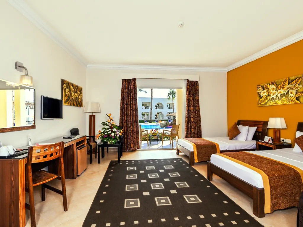 Dla max. 3 osób, Przestrzeń zewnętrzna: Balkon lub taras, Kanały telewizji: Polski, Angielski, Telefon w pokoju, prysznic, Powierzchnia pokoju: ok. 28 - 34 m2, Dostawka: łóżko standardowe, Rodzaj podłogi: płytki, Sprzątanie codziennie, miejsce do pracy, 1 sypialnia, Przepierzenie, Maksymalna liczba osób dorosłych: 2, Maksymalna liczba dzieci: 1, Widok na ogród i basen, Liczba łazienek: 1, Liczba toalet: 1, Zestaw do parzenia kawy i herbaty (dodatkowo płatne), Klimatyzacja: Klimatyzacja indywidualna