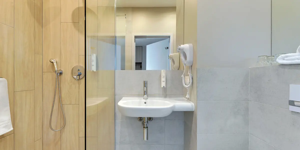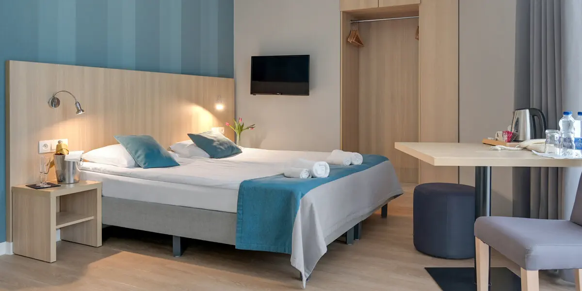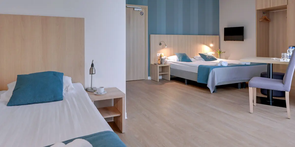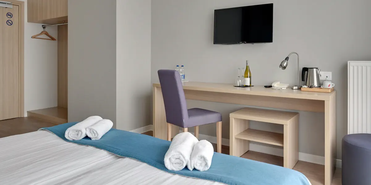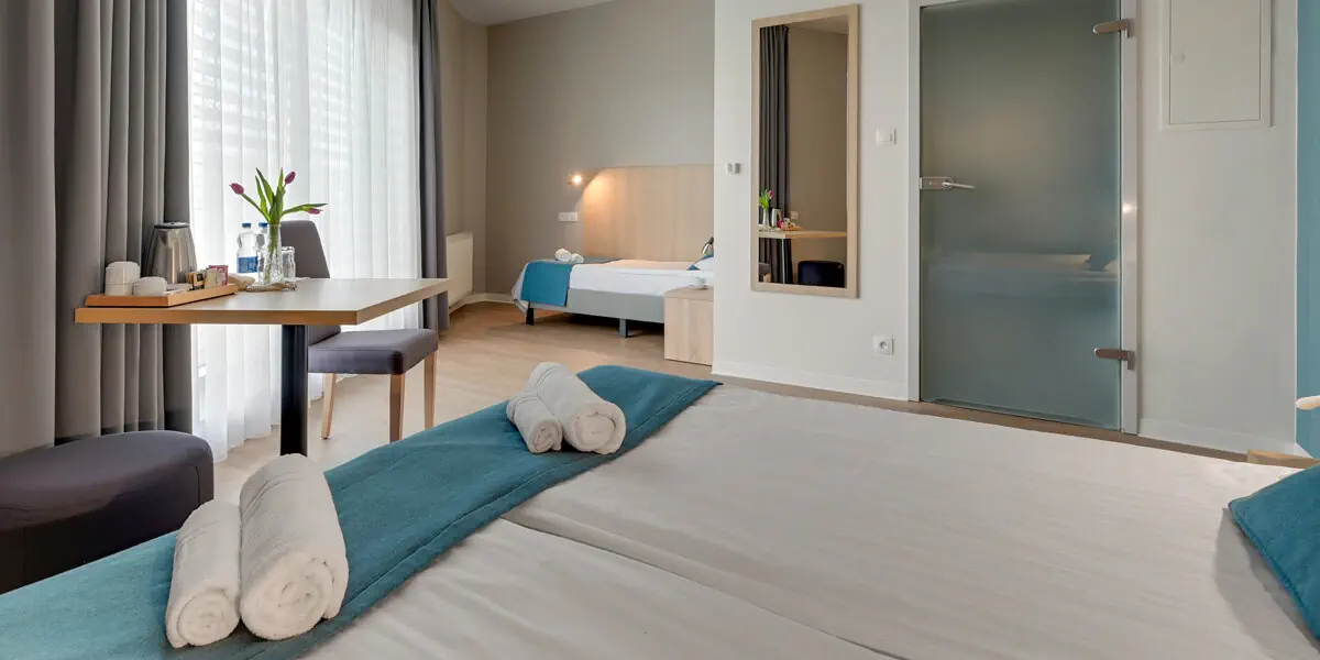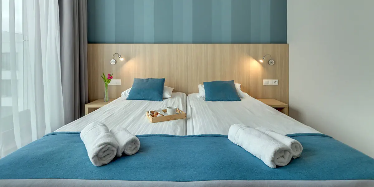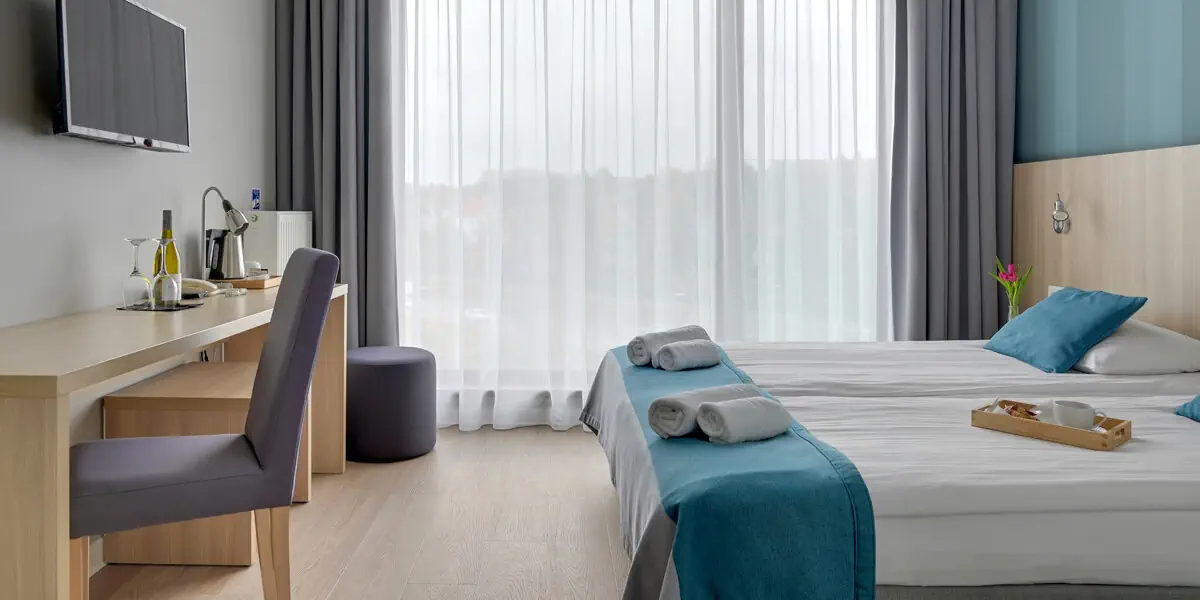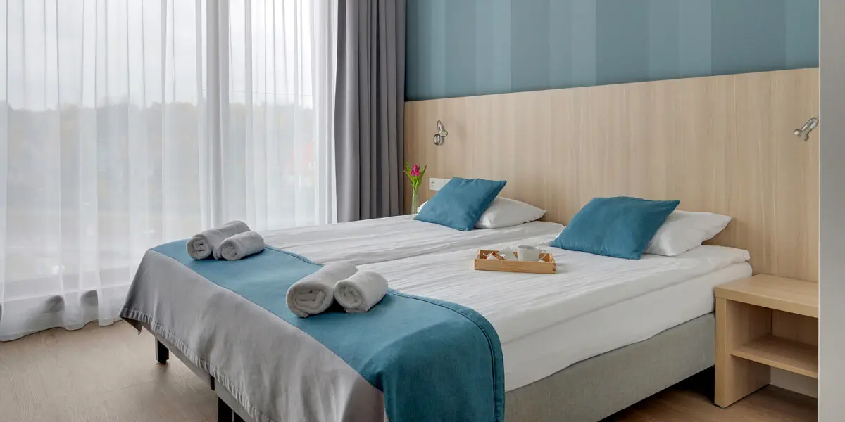 Komfortowo urządzony pokój z dwoma łóżkami pojedynczymi z możliwością złączenia. W wyposażeniu: TV, Wi-Fi, łazienka z prysznicem, suszarką do włosów, ręcznikami i kosmetykami.