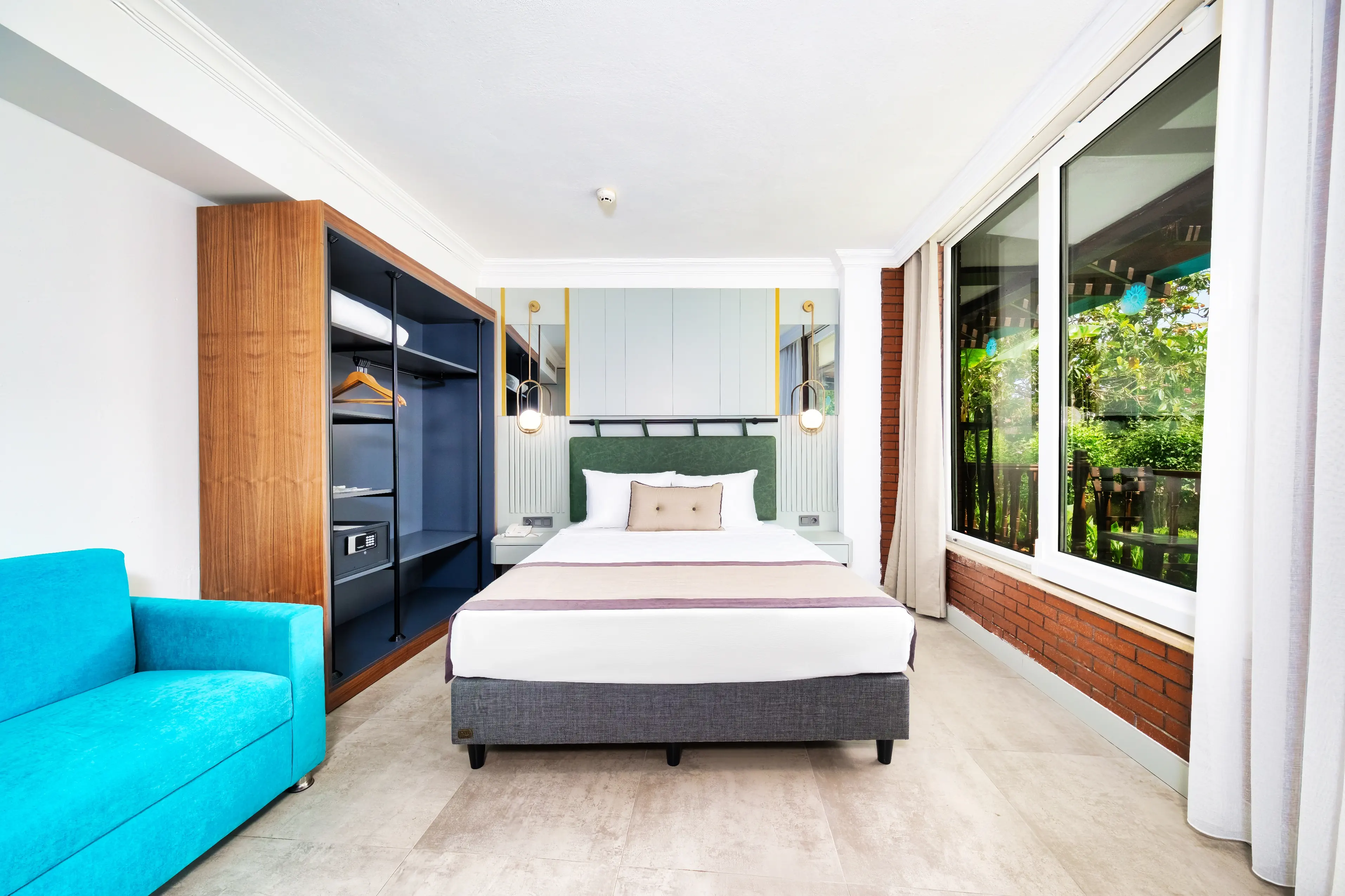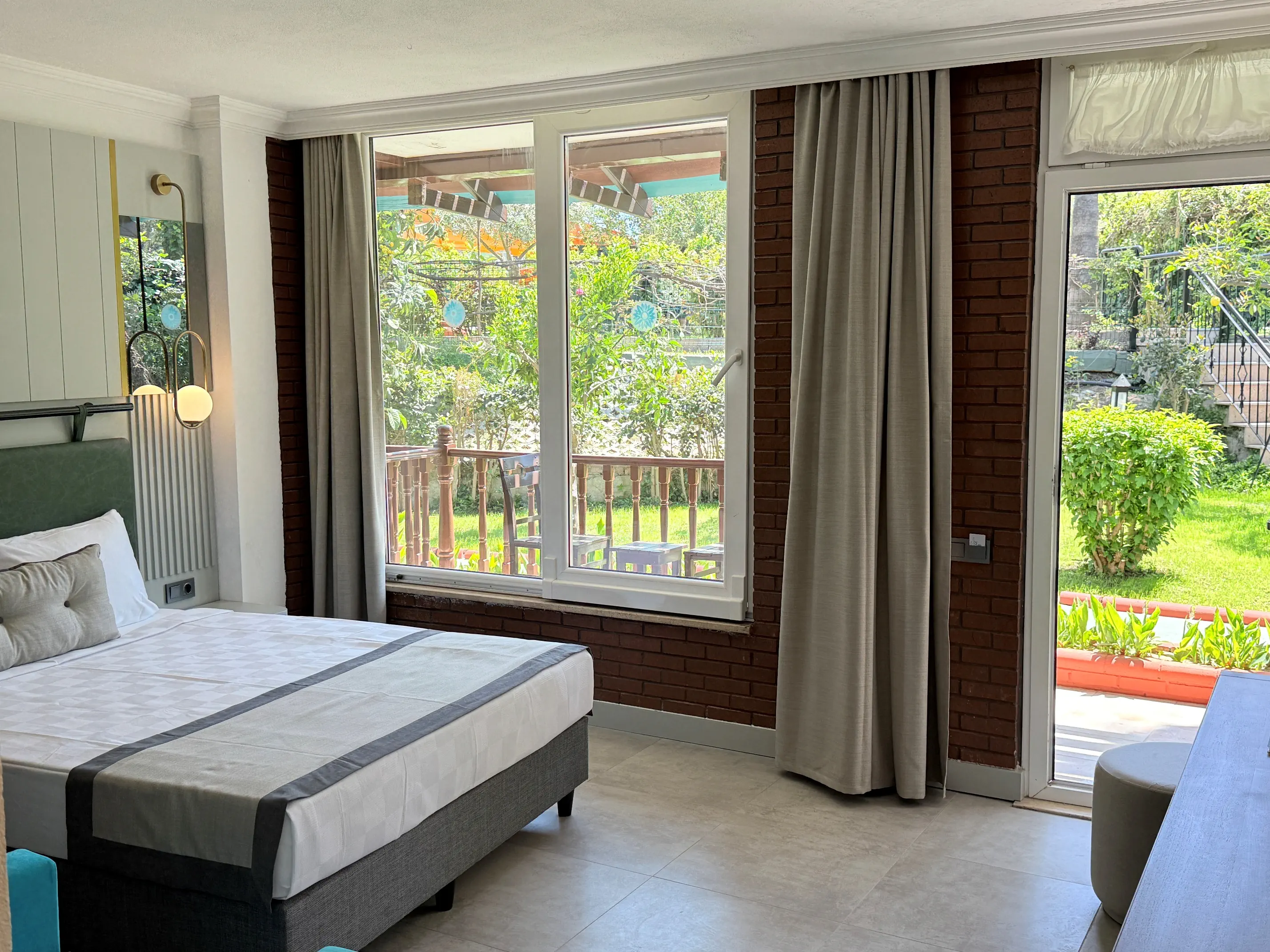 Dla max. 3 osób, Przestrzeń zewnętrzna: Taras, Kanały telewizji: Polski, Angielski, Telefon w pokoju, prysznic, Powierzchnia pokoju: ok. 24 - 26 m2, Dostawka: sofa, Rodzaj podłogi: płytki, Sprzątanie codziennie, 1 sypialnia, Maksymalna liczba osób dorosłych: 2, Maksymalna liczba dzieci: 1, Widok na ogród, Liczba łazienek: 1, Liczba toalet: 1, Zestaw do parzenia kawy i herbaty, Klimatyzacja: Klimatyzacja centralna, Działa w godzinach: Maj, Czerwiec, Lipiec, Sierpień, Wrzesień
