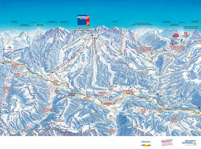 Na szczycie Kronplatz (Plan de Corones), mierzącym 2275 m n.p.m., spotykają się pasjonaci białego szaleństwa z południa, północy i wschodu. Innowacyjny ośrodek narciarski, który wznosi się ponad Doliną Pusterii, oferuje niemal 120 km doskonale przygotowanych tras o różnych poziomach trudności i 55 nowoczesnych wyciągów. Stoki Kronplatz tworzą imponującą nartostradę. Kornplatz połączony jest z największą narciarską karuzelą na świecie, czyli Sella Rondą!