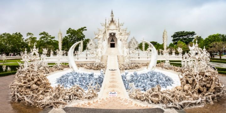 Wat Rong Khun, czyli spektakularna świątynia buddyjska położona w pobliżu miasta Chiang Rai w północnej części Tajlandii. Jest to niezwykłe dzieło sztuki i architektury, zaprojektowane przez tajskiego artystę Chalermchai Kositpipat. Świątynia Wat Rong Khun wyróżnia się białą fasadą i oryginalnym stylem, który łączy elementy tradycyjne z nowoczesnymi. Została zbudowana z białego betonu i pokryta białym tynkiem, aby uzyskać wygląd, który symbolizuje czystość i oświecenie. Wielokrotne odbicie światła na białym tle tworzy wrażenie, że świątynia jest pokryta złotem. Architektura i dekoracje świątyni są pełne symboli buddyjskich i elementów religijnych.